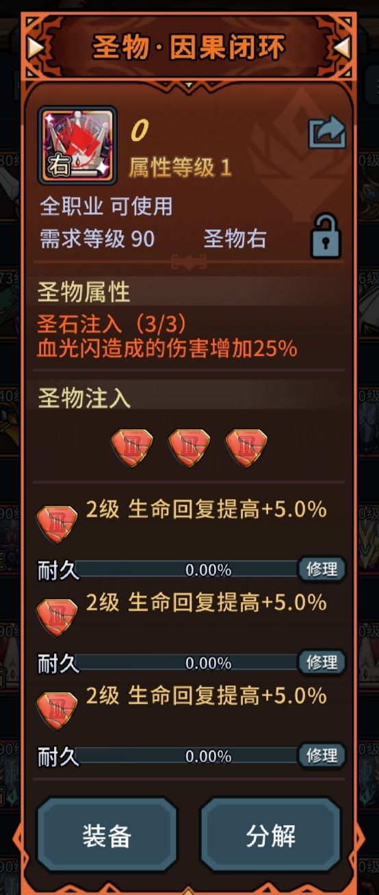 ——圣物的极品大概就是多孔单一圣石了,一个带5个同一圣石孔的就是极品,因为可以选择相同的圣石,就如同我这3三角孔的圣物,叠加了3个5%生命回复的圣石,而极品的5孔+3极圣石,大概是5×8%=40生命回复,配齐左右两个就能得到80%的生命回复,打恶魔之眼是非常大的加成,相当于3件装备的加成。