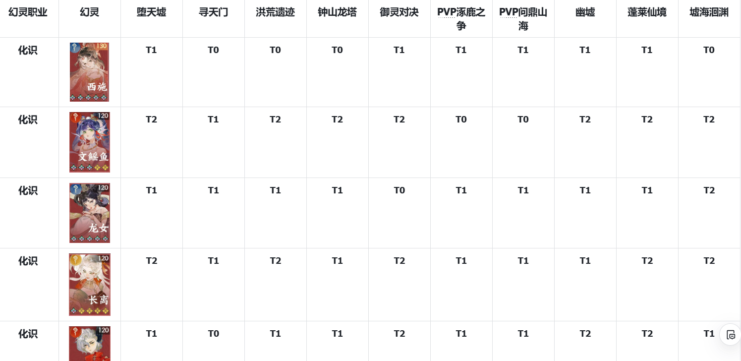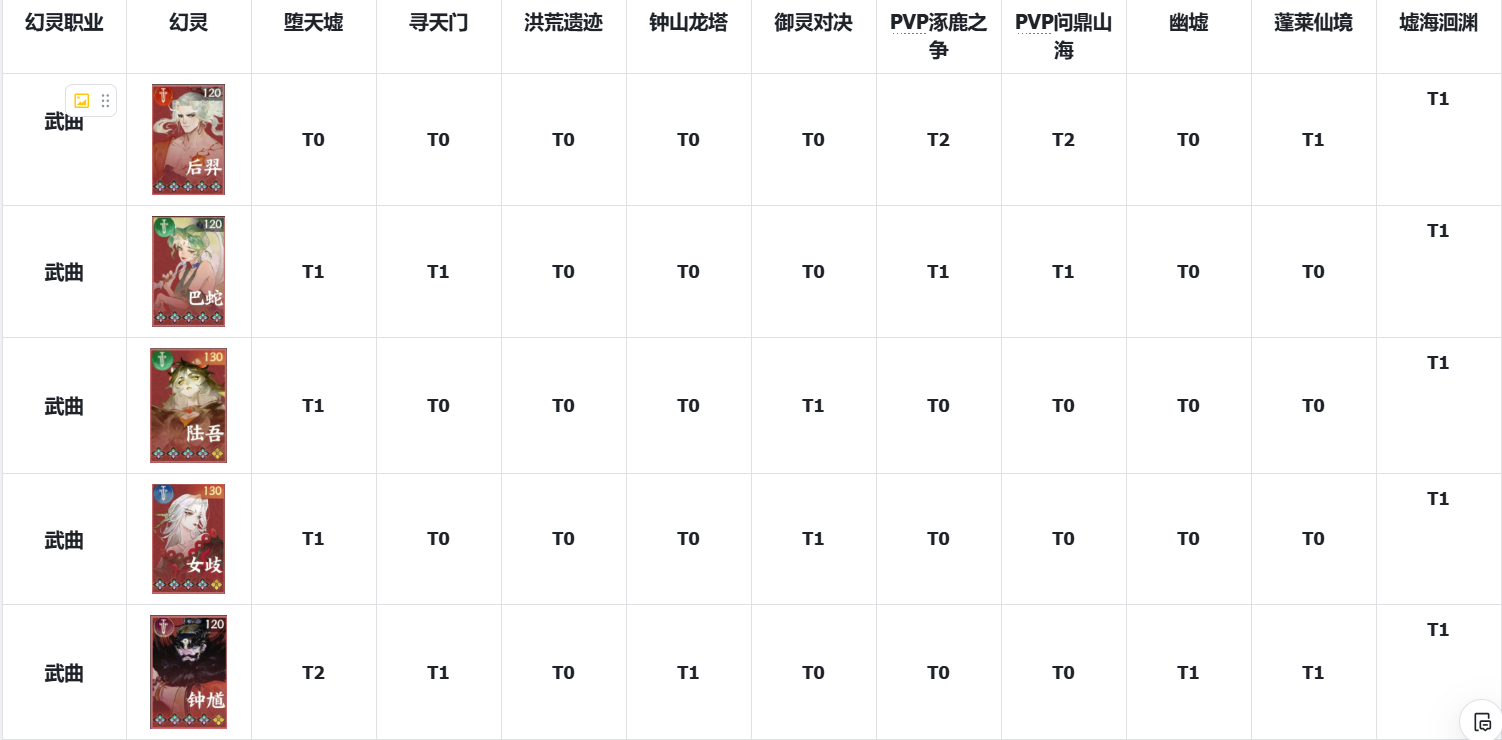 正文:经过了半年的沉淀和探索,大家对于幻灵们的强度有更多的理解,所以特地出一期现在幻灵们的玩法强度榜单和大家探讨一下 榜单分为三档:T0(绝对强势,夯的不行) T1(有不错效果,好用) T2(效果一般,不好用) 本期为武曲和化识的榜单,可以简单作为参考,有任何意见欢迎评论
