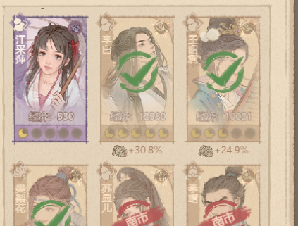 人物下方的百分比就是僚属的经济加成。选择最高的任命。之后任命南市,北市,金矿,粮草,木材,不良司和学堂。