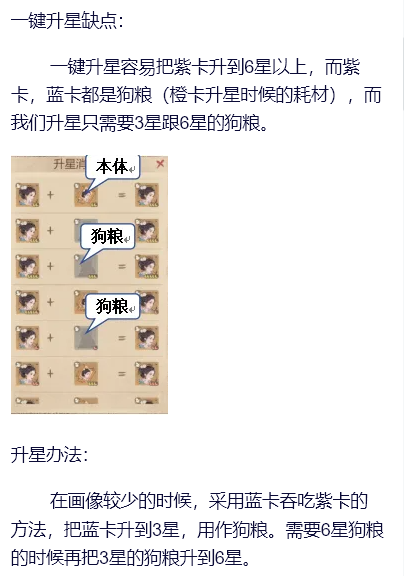 3、武将升星。武将升星不一定都要用本体,对于很多主力武将,本身就不好抽到。再浪费本体去升星,就会很难受。必须要本体升级的等级之外,其它星级都用狗粮去升,就是其它卡的画像作为升级材料。尽量不要一键升星,最好手动操作