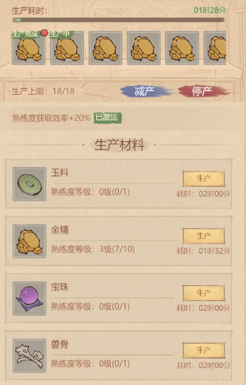 如图所示,这个生产材料是有熟练度得。尽量多人配合,每个人生产一种,通过市场交换,最快得时间做出高级材料,才是最佳配比。单机很难