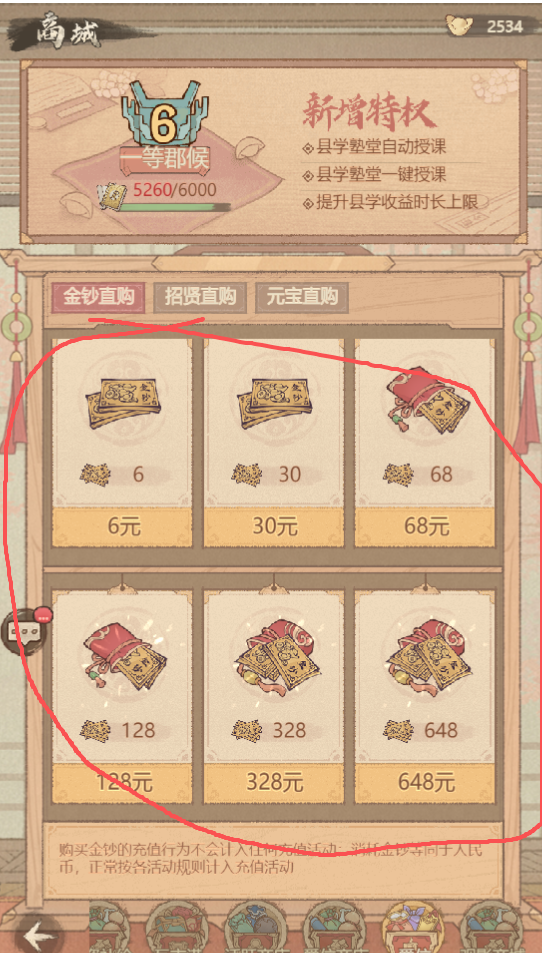 4、充值问题,需要充值,先买金钞,金钞就等于预存的人民币,用金钞再买礼包,会获得双倍爵位经验