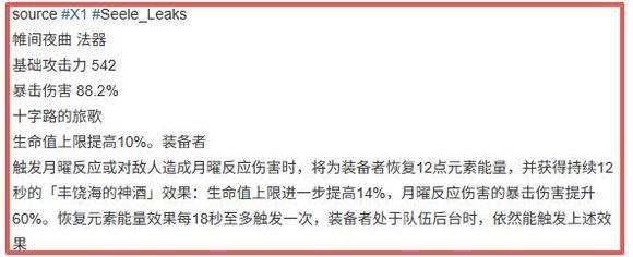 除了少女的专武以外,白马仙人的专武效果也曝光了,不过白马仙人的武器效果更加的简洁,从属性方面来看,可以确定白马仙人就是一个主c的定位。首先是提升88.2%的暴击伤害,其次她是吃防御力倍率的,武器效果直接能够提升20%的防御力,以及释放完元素战技之后月结晶反应提升64%,如此精简的武器效果也是不多见了。除了新的专武以外,还有两套新的圣遗物套装,第一套是越反应体系的专属圣遗物套装,两件套提升80点精通属性,四件套则是提升造成的月曜反应伤害,并且当队伍是满辉状态的时候提升效果还会进一步加强,不过这个套装是后台角色使用的,在前台的话3秒钟之后就会失效了。