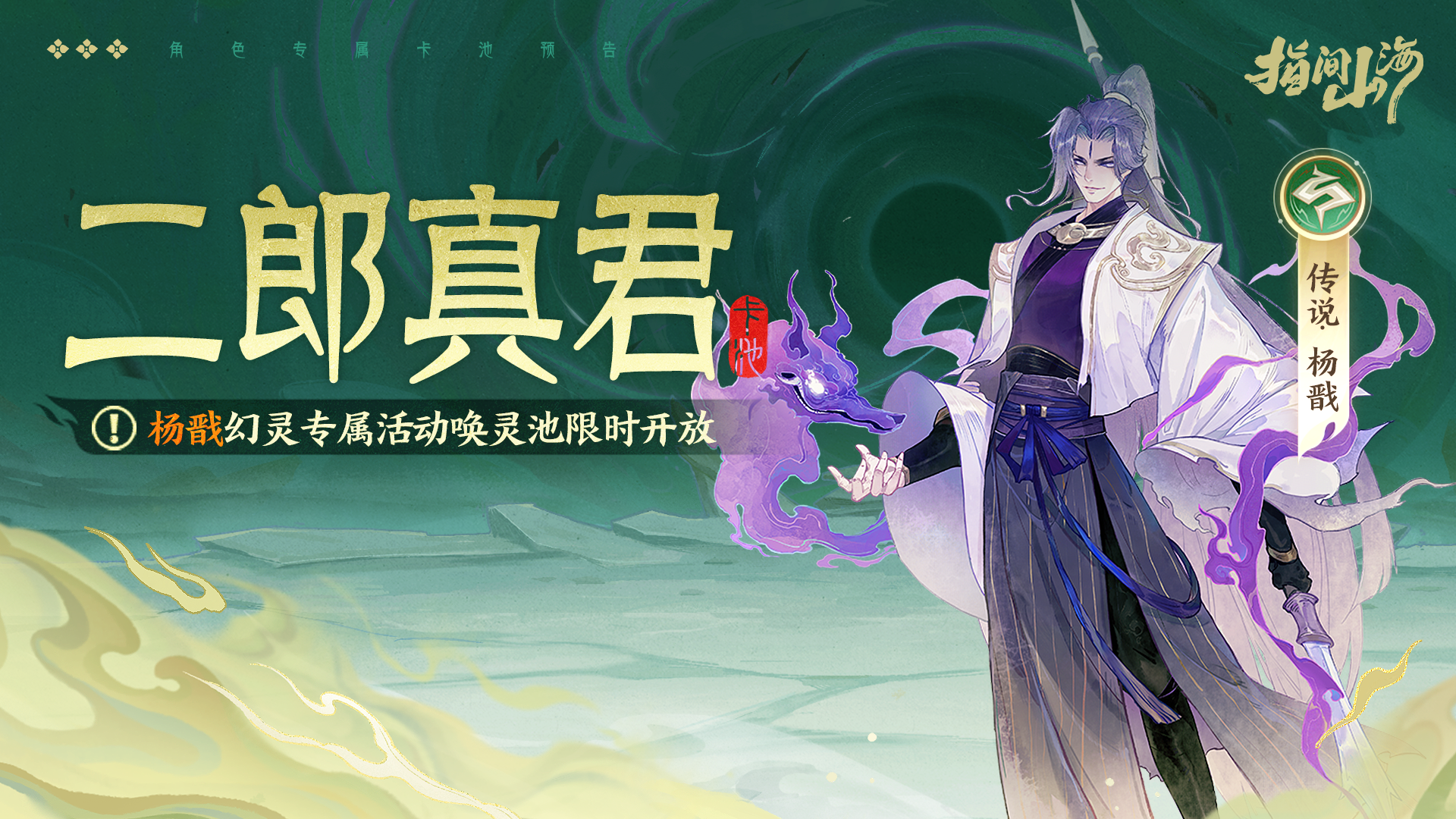 「二郎真君」-「杨戬」限定招募活动时间:开服后第161天~167天活动说明:活动期间内,传说幻灵「杨戬」专属卡池「二郎真君」开放,50次招募必得传说幻灵!首次获得传说幻灵不是「杨戬」时,第二次获得传说幻灵100%为「杨戬」。具体可查看游戏概率公示界面。
