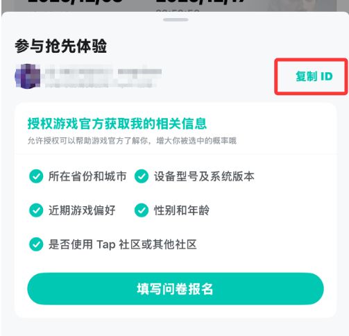 (温馨提示:问卷需要填写tapID,用于发送测试资格等站内信。建议主公们在点击报名后的弹出框右上角,先“复制ID”,再进入问卷页面),如下图:
