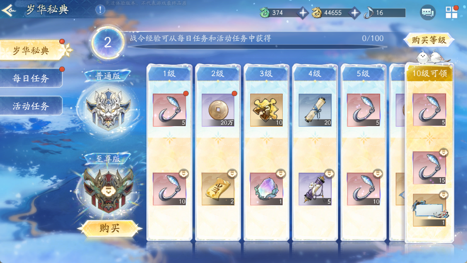 2. 普通版岁华秘典可免费领取,进阶版需要购买解锁后领取;