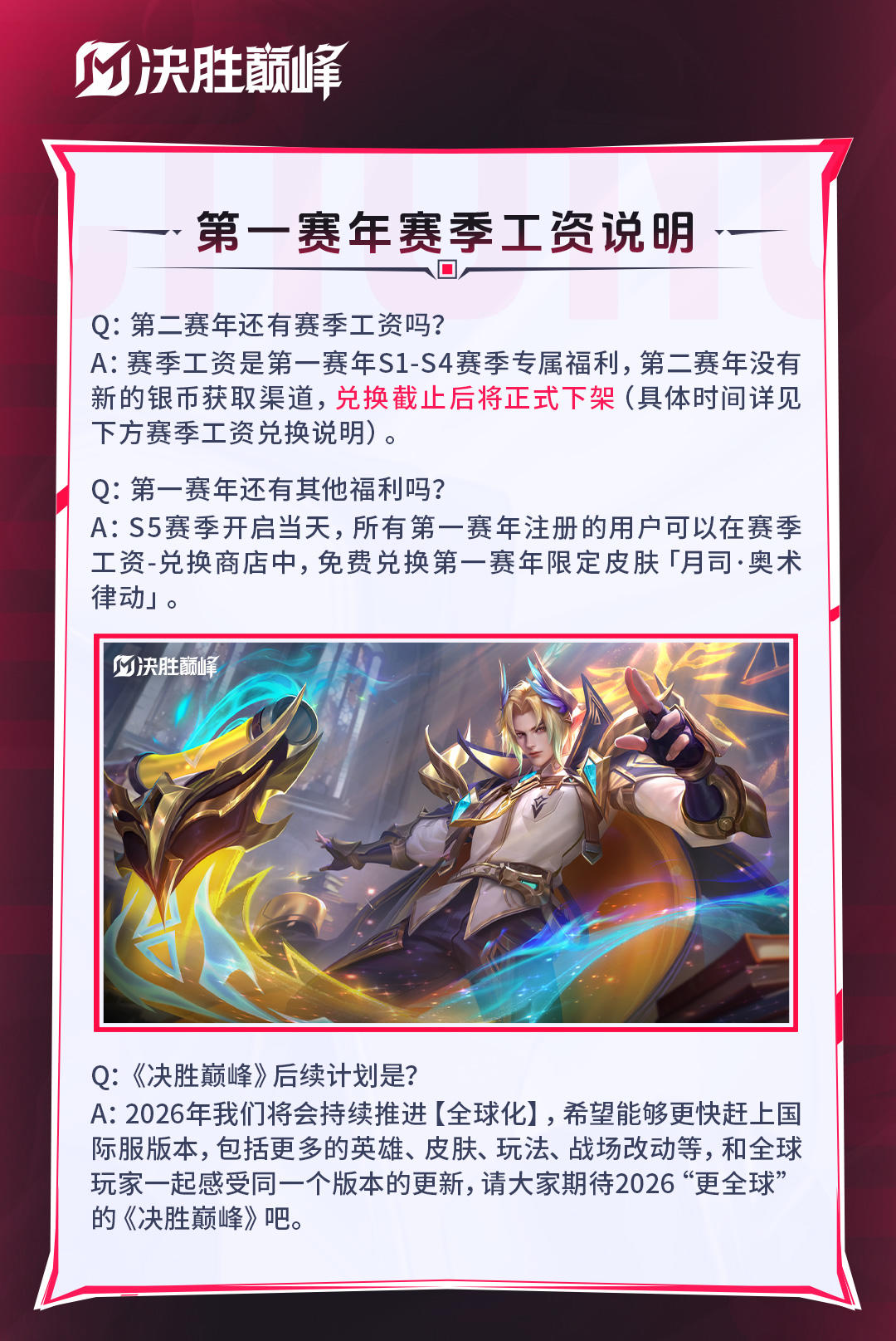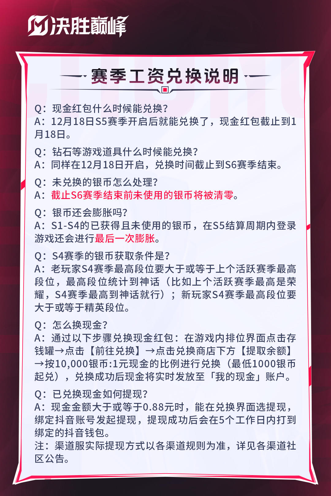 《决胜巅峰》将于2025年12月18日更新S5赛季,赛季工资将同步开启兑换,进行最后一次赛季工资结算。请各位玩家查看下方说明,避免错过重要信息。