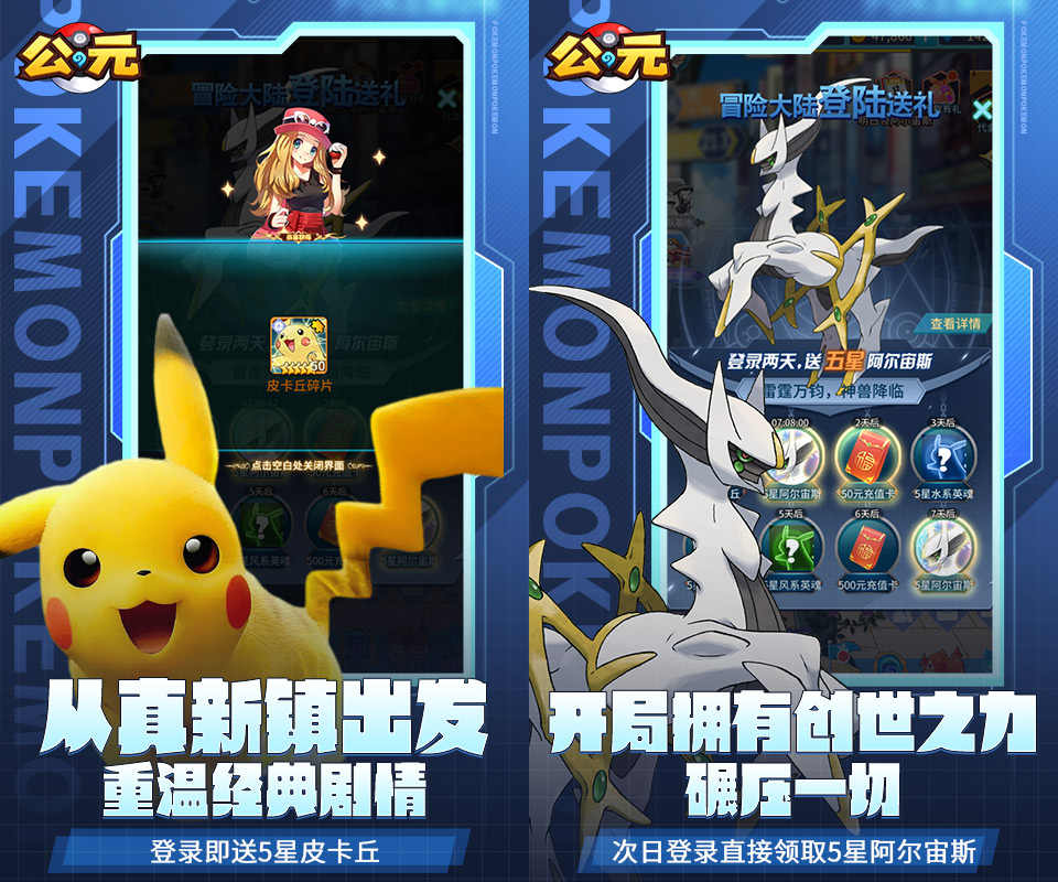 第一天直接送皮卡丘,第二天送阿尔宙斯。算是前期玩的比较爽的一款了。