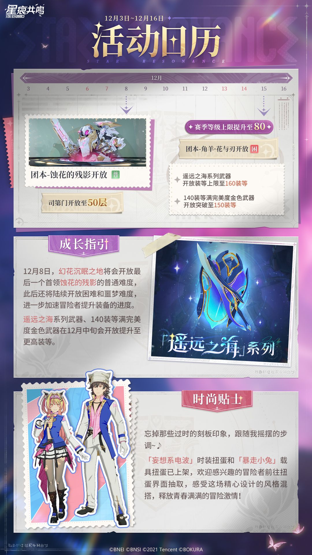 12月8日,团本首领-蚀花的残影普通难度开放挑战,后续还将陆续解锁团本困难、噩梦难度;遥远之海系列武器、140装等满完美度金色武器将在12月中旬开放突破,可进一步提升武器装等;妄想系电波、暴走小兔扭蛋现已上架,感兴趣的冒险者不要错过。