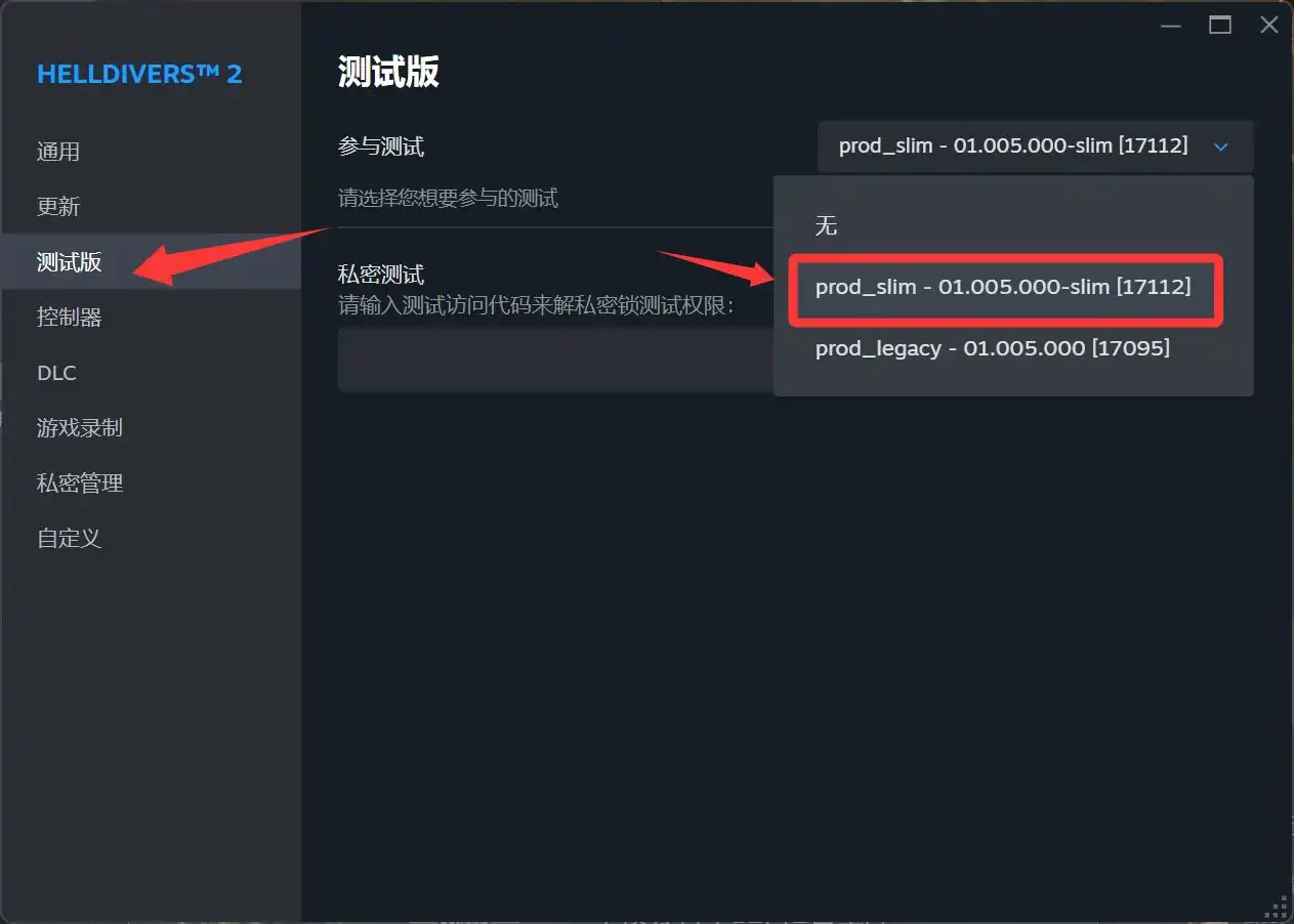 找到“测试版”页面,将右侧的“参与测试”中改为第二个(默认是无),之后关闭页面即可。
