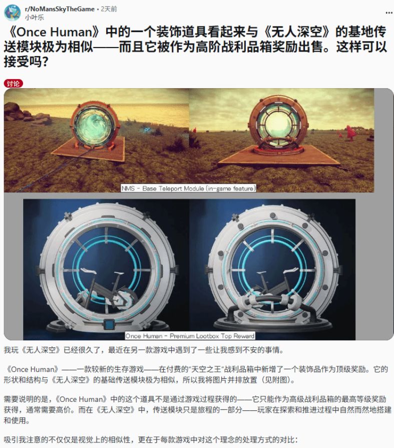 网易Starry Studio开发的生存游戏《七日世界》,近日再因付费内容涉嫌盗用素材引发争议,Reddit网友指控其新增付费家具“光轮圆环”,高度抄袭《无人深空》的 “基地传送模块”。