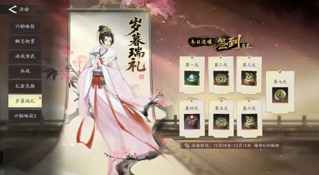 新增签到活动“岁暮瑞礼”,全部服务器同步于12月4日06:00:00至12月13日05:59:59开放,活动期间累计登录7天,可获得丰厚奖励;