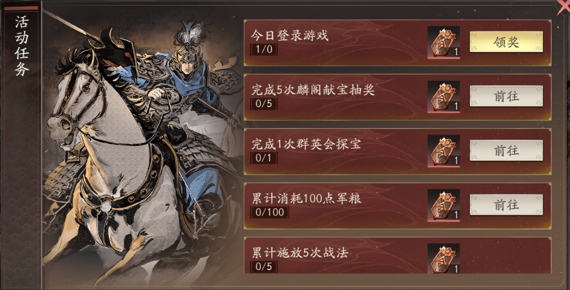 (3)累计完成指定轮次,可额外领取主将外观-张辽·夜啼、龙骧之印、武器外观-御龙吟等丰厚奖励。