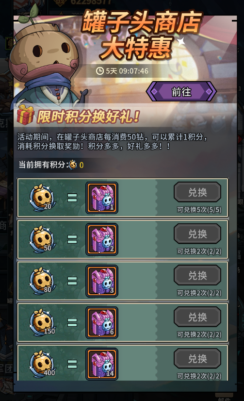 活动期间在罐子头商店每满额度的钻石消费,可以累计积分,消耗积分可在罐子头大特惠商店兑换道具