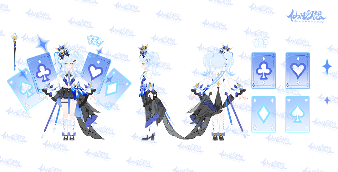 翎音的形象也迎来全新蜕变:蓝色双马尾多了几分俏皮,与蓝白礼服搭配,百变魔法师的气质尽显;身旁纷飞的卡牌,在法杖的控制下在虚实交错的戏法中,将魔法的灵动显示得淋漓尽致~