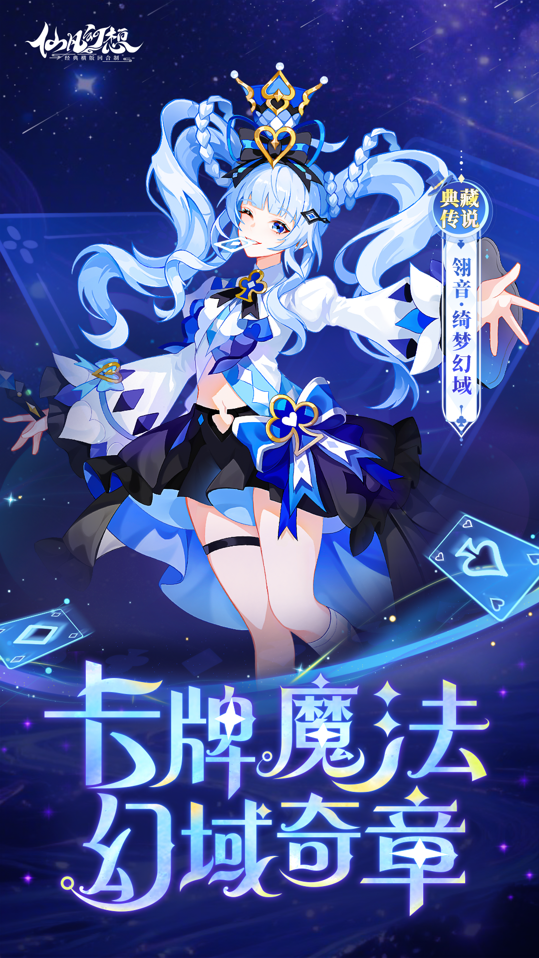 全新传说皮肤中翎音着蓝白礼服,以卡牌为媒介将舞台化作魔法结界,指尖轻弹间卡牌纷飞~