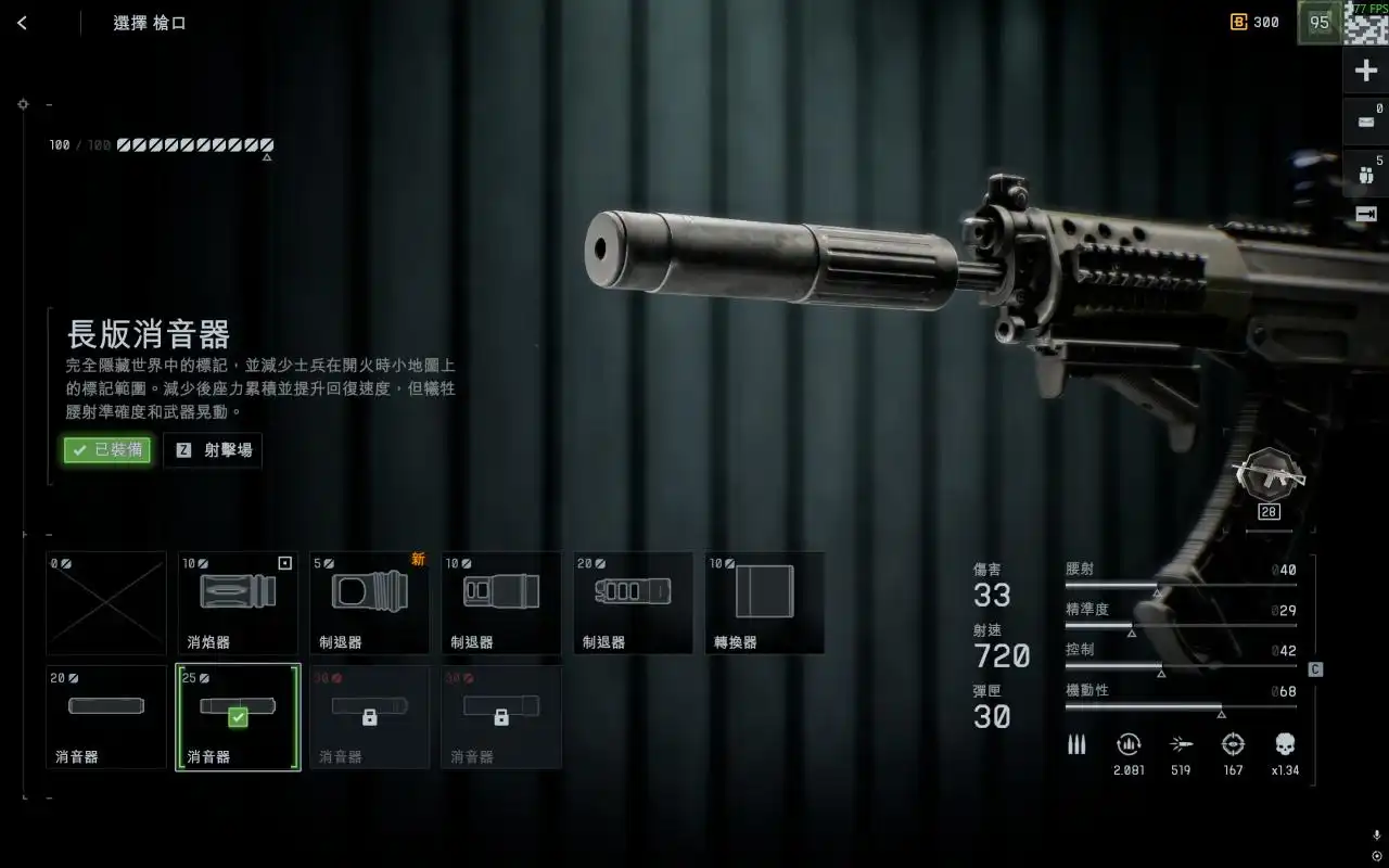配件推荐:长版消音器+轻型枪管+细型直角握把+30发快速+初始子弹+弹夹卡槽+mini1倍镜消音器选择25点数能降低后坐力的消音器,轻型枪管能增加开镜瞄准准度+开镜速度,也是必点项。细型直角握把在降后坐的同时还能加快拔枪速度和开镜速度而且没有任何负面效果。mini1倍镜广阔的镜内距离用起来也是相当赏心悦目。