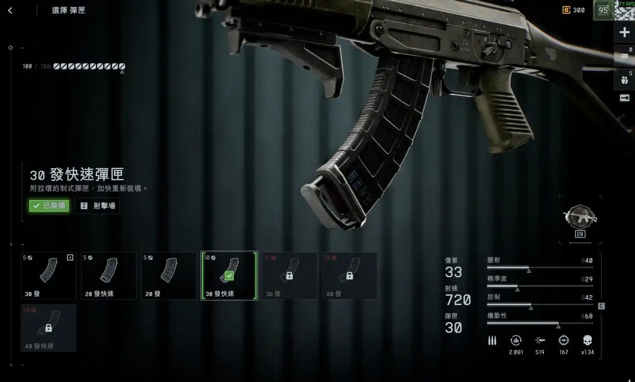30发快速和弹夹卡槽提供续航,把原来2.5s的换弹速度减到2秒,别小瞧这0.5s,在点里绞肉的时候多这0.5s就有可能多杀一个人