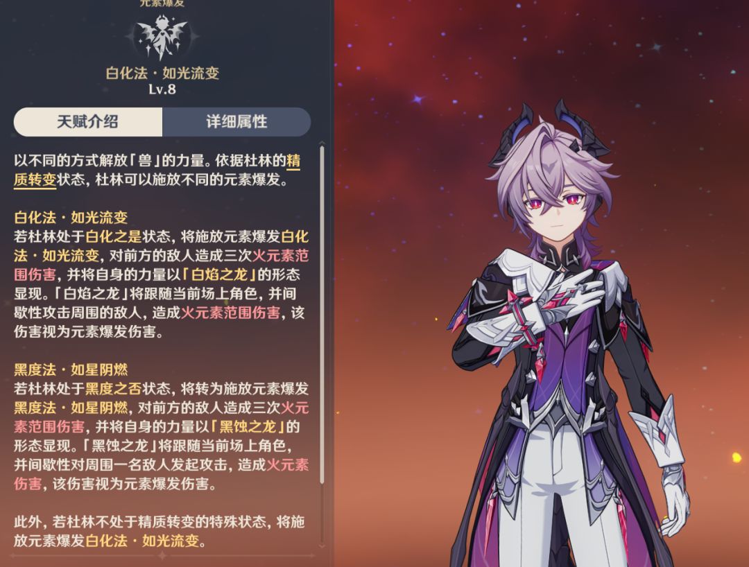 杜林是原神月之三版本,刚推出的五星火系单手剑角色,定位是后台功能性副C/辅助。他的核心特点是,可以通过切换“黑龙”与“白龙”两种不同的形态,在战斗中发挥不同的效果!