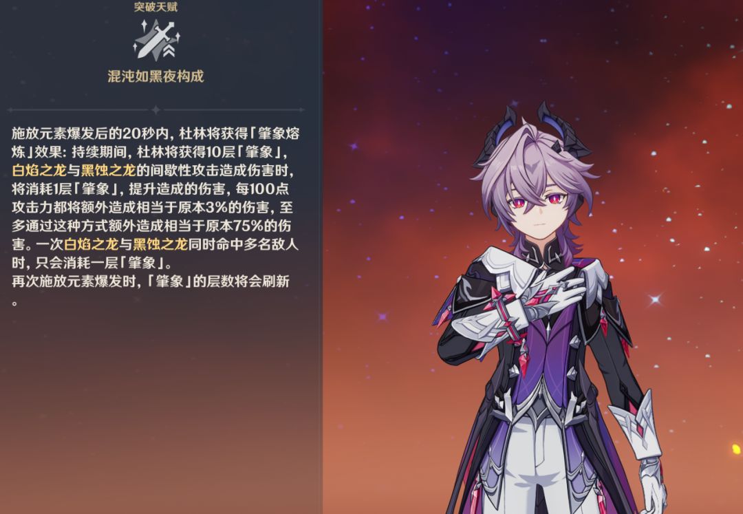 从命座的角度来讲,杜林0命就是完整体,1命提升后台伤害,2/4命提升辅助能力,至于6命的话,杜林完整体,氪佬的玩具!肯定不弱的,拾柒就不过多分析了!