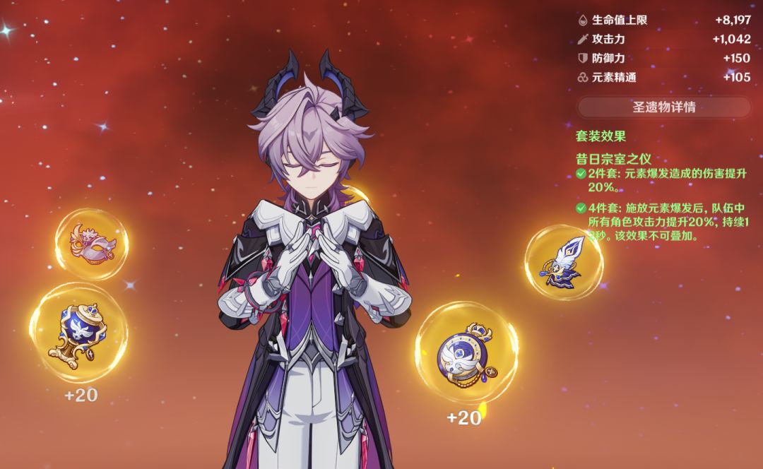 别看文字描述很多,其实中心思想就一个,堆攻击力就完事,辅助能力是吃天赋,不吃面板,带能后台增伤的圣遗物都行,比如绝缘、宗室都可以,主词条建议带充攻暴,或者充火暴均可。