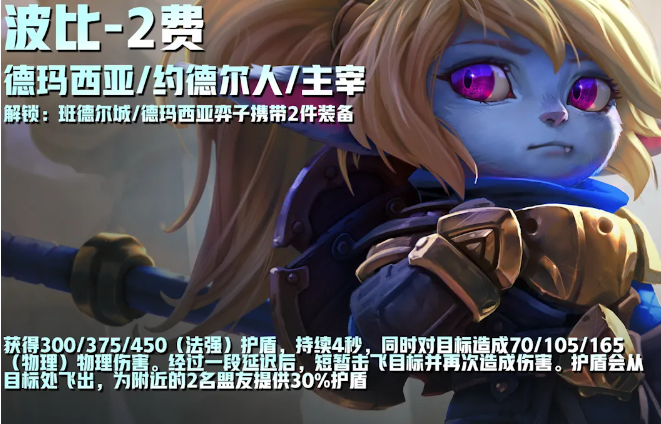 波比:约德尔人或者是德玛西亚弈子装备两件装备即可解锁