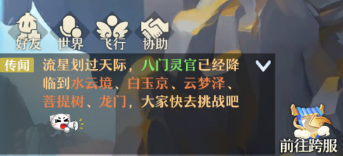 1、 新增前往跨服入口,常驻于主界面下方位置,仙友们日后可更便捷地前往跨服环境组队挑战完成任务。