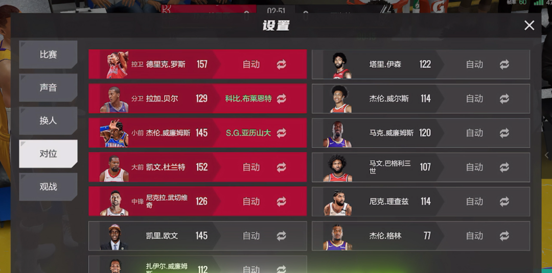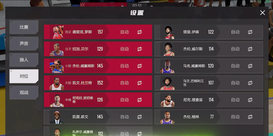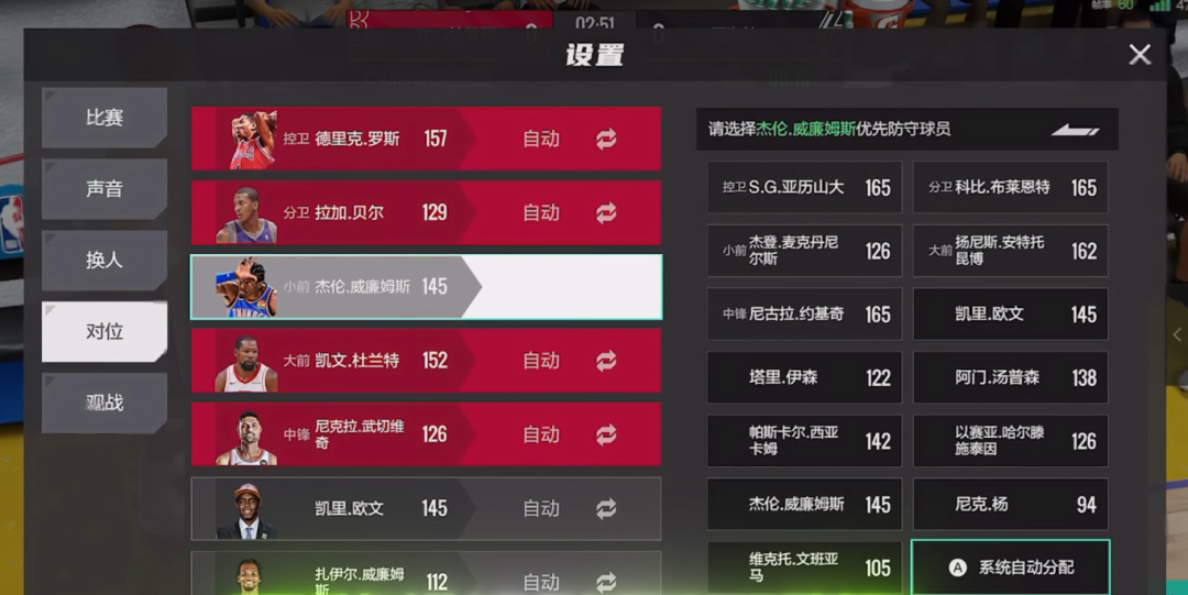 进入对局,在设置界面中,选择“对位”,选择自己的“3D型球员”去对位对方的单打手。