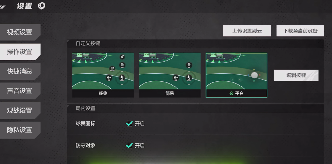 如果还是不能防住对方球员,你需要“无限换防轮转 ”,首先将操作设置更换为“平台按键”。