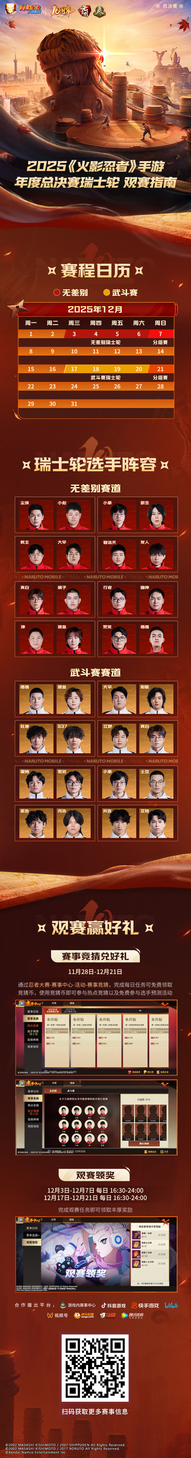 2025《火影忍者》手游年度总决赛无差别瑞士轮于12月3日16:30率先开赛,武斗赛瑞士轮则于12月17日16:30开赛,双赛道16强选手蓄势待发!除了激动人心的比赛,还有不少赛事活动~赛事期间,学员们可在游戏内赛事中心参与赛事竞猜和观赛领奖活动,想了解更多观赛详情的学员,快点击下方查看豚豚准备的一图流攻略吧!