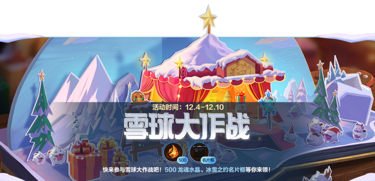 雪球大作战活动将于12月4日(明日)11:00至12月10日23:59期间内开启!召唤师完成活动任务即可获得龙魂水晶*500、名片框-冰雪之约奖励~