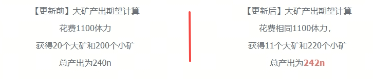 在更改大矿私有化逻辑(大矿采集不再消耗体力)后,大矿产出的概率会有对应调整,收益维持一致。目前已经通过游戏内邮件发送相关说明,请冒险者们在游戏内查收~
