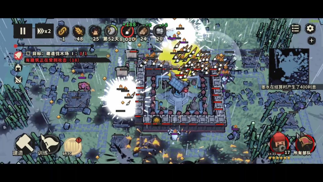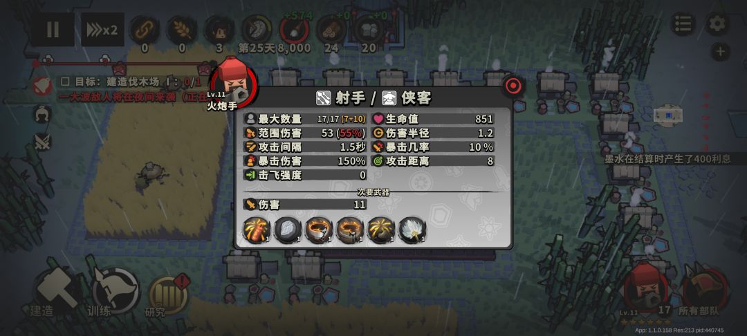 如图所示,11级的火炮手天赋点6下就可以胜利,局内操作仅需要40人口,2级主城,围着主城造一圈木墙,操作两分钟即可挂机