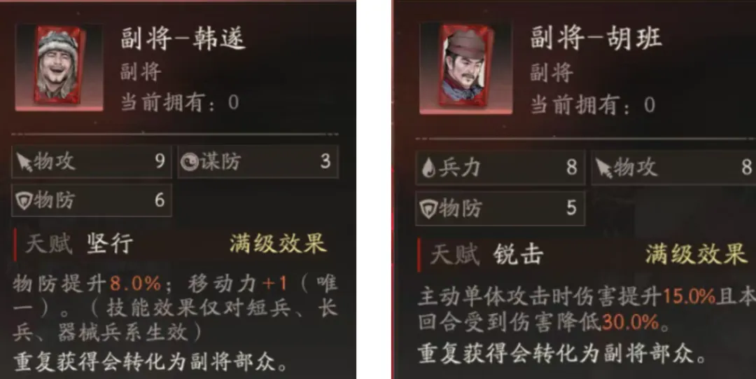 不过对于大部分朋友而言,可能从实用性来说两个副将无疑是更加重要的选择,这里咱们可以从上图中看到这两个副将的大致效果,不过需要提出的一点注意事项是,图片上显示的效果是拉满的效果,所以大家在初步入手时肯定数值是要比这个低不少的。其中韩遂这个副将的物防提升数值肯定是根据练度提升而逐步上涨的,但维一也相信这个移动力+1的效果应该是乞丐版都能自带的效果,虽然这个+1只能为短兵、器械和长兵角色提供帮助,但客观来讲吧......作为一个机制上的改变,而且是本游戏极为稀缺的移动力提升效果,维一个人更倾向于韩遂的不可替代性要稍高于胡班。接着针对胡班而言,其最大的特点就是提升主动单体输出和降低本回合受到的伤害,其实从数值上来分析,满级后30%的减伤幅度和15%的单体增伤幅度还算是颇为不凡的,而减伤和增伤对于很多角色也都是比较需要的,例如高难副本中是不是给张飞就会大幅提升他的坦度呢?又例如给关羽,是不是就能提升关羽的斩杀线呢?不过15%和30%也只是满级后的数值,乞丐版的话......大家可以猜一猜到底能有多高,哈哈。