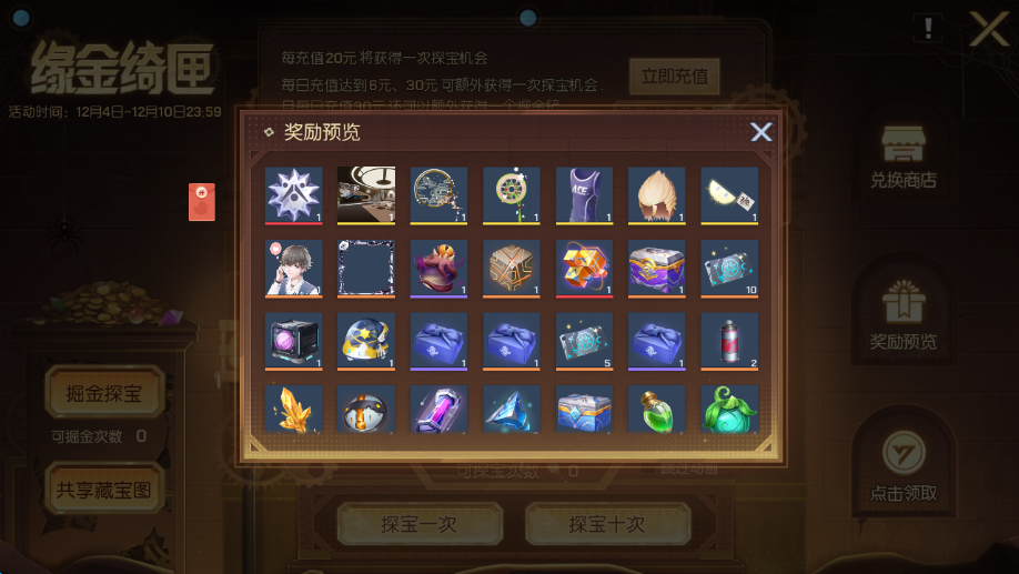 使用掘金铲,可以挖掘宝箱,收获惊喜好礼与寻金罗盘;开启金色宝箱更能为全服共享珍贵的藏金秘卷!借助寻金罗盘,你将能精准定位隐藏的宝藏,有机会获得红色圣印·澜炘、个人名片·未来视界、背饰·春望、头饰·雾月云窗、派对心情·衣、派对心情·发,派对心情·头饰等稀有奖励!