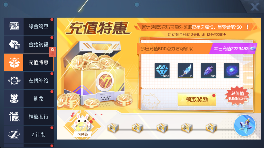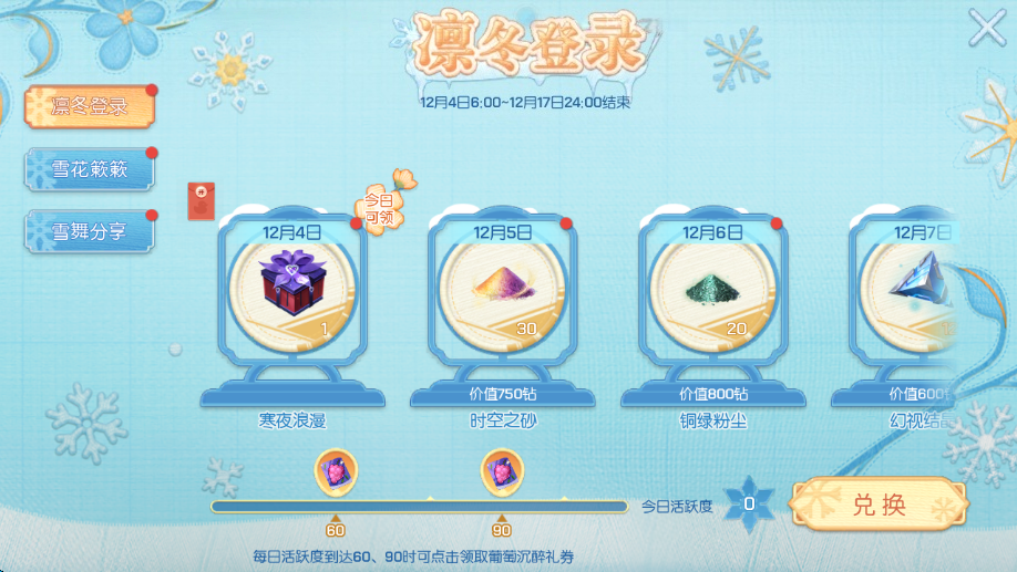 12月4日更新后至12月10日23:59,每日充值600点券可在活动界面领取每日额外奖励,活动期间累计领取5次奖励后,可以额外领取绘梦赠礼!(更新完成活动开启后的充值才会计入每日充值目标,有需要的同学请在更新后进行充值哦)