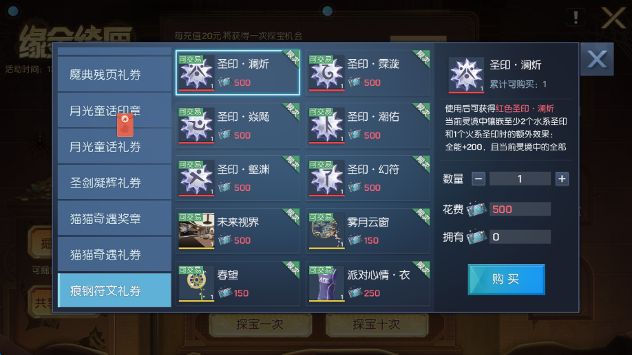 同时,使用痕钢符文礼券可兑换红色圣印·澜炘、红色圣印·霂漩、红色圣印·焱飏、红色圣印·潮佑、红色圣印·壑渊、红色圣印·幻符、个人名片·未来视界、背饰·春望、头饰·雾月云窗、派对心情·衣、派对心情·发,派对心情·头饰等众多珍稀奖励。