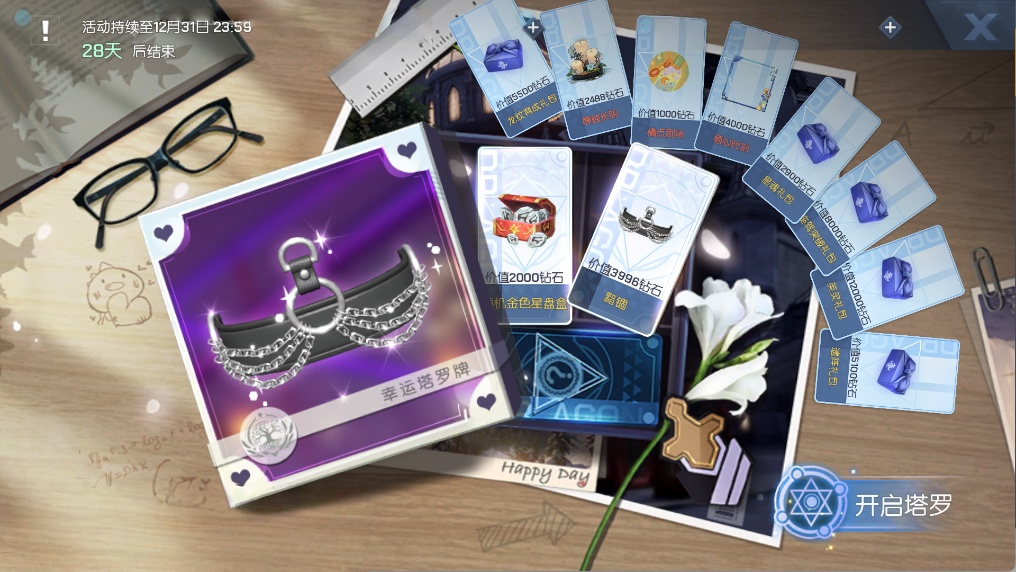 12月4日活动开启后至12月31日23:59,翻开最多10张神秘的塔罗牌,随机获得藏于其中的黯锢·面饰,橘点剧场·聊天背景,静烛长明·头像,栖心时刻·头像框等限定奖励!