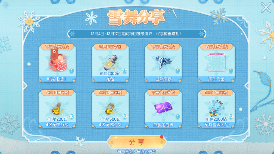 12月4日6:00~12月17日24:00期间,每日登录及达到指定活跃度,即可领取龙萤、龙裔基因序列、4级龙蜕精华、4级龙蜕凝液、冥界之焰、葡萄沉醉礼券等好礼~