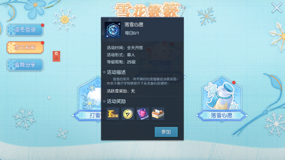 12月4日6:00~12月17日24:00期间,每天去卡塞尔学院的喷泉边许下心愿,即可获得经验、金币、落雪暖绒礼盒、葡萄沉醉礼券等好礼哦~