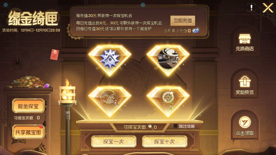缘金绮匣,探索传说秘宝!12月4日10:00至12月10日23:59,累计充值点券达到一定数额,便可激活神秘的鉴金镜,启程探宝之旅!有机会获得掘金铲,红色圣印·澜炘、个人名片·未来视界、背饰·春望、头饰·雾月云窗、派对心情·衣、派对心情·发,派对心情·头饰、头像·倾心之联、头像框·真心通话以及痕钢符文礼券等各类超值道具!