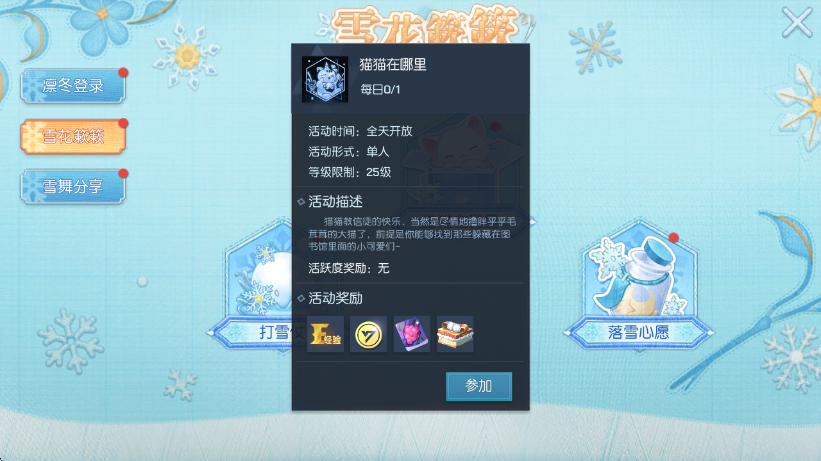 12月4日6:00~12月17日24:00期间,每天去图书馆寻找藏在角落的猫猫,即可获得经验、金币、落雪暖绒礼盒、葡萄沉醉礼券等好礼哦~