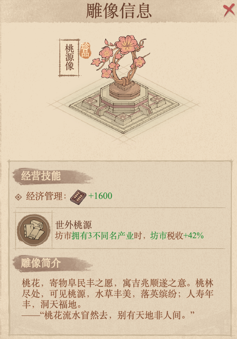 另一款是“桃园像”,可以增加42%税收加成非常高了,比周年庆城主像(36%)和氪金赵公明像(36%)更胜一筹。触发条件需要坊市拥有3个不同名产业,基本100%就能激活。对于税收缺口大的玩家,堪称必入选择。