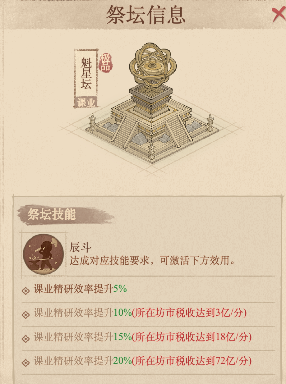 “魁星坛”,属于极品品质,主要效果是显著提升课业研究的速度。需要留意的是,它与之前活动中推出的“玉荔祭坛”无法同时生效,因此已经拥有后者的玩家不需要。但是错过“玉荔祭坛”,非常推荐花费700左右攒一个。属于早买早享受的道具。