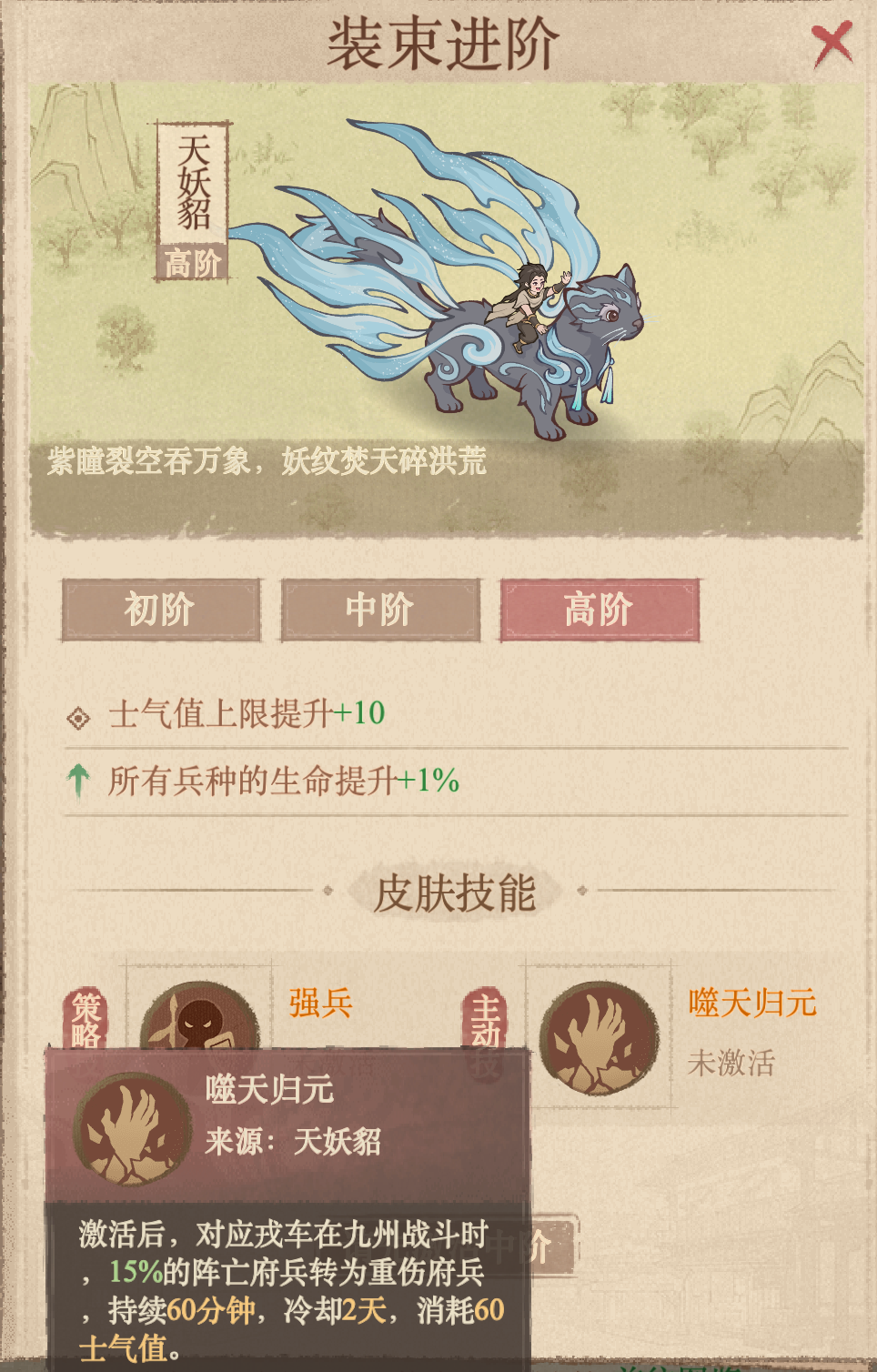 此次推出的戎车新装束名为“天妖貂”。其外观设计带有本次联动的特色风格。从功能上看,其附带技能的效果,是将一定比例的阵亡府兵转化为重伤兵,这对于交战频率较高的玩家而言,可能具有一定的实用性,但冷却时间2天也不短。建议对外观有偏好、或经常参与打架的玩家考虑。