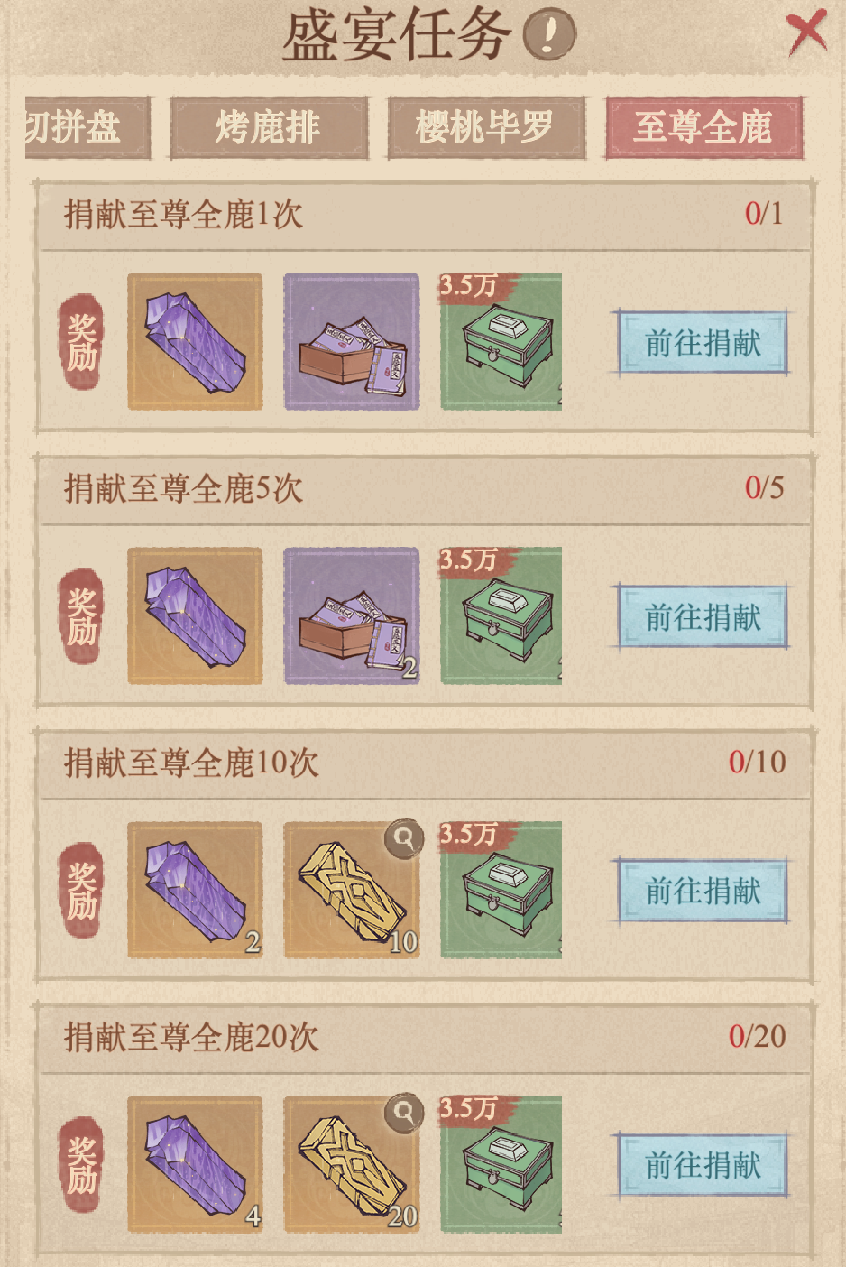 - B方案:0冷切拼盘+5烤鹿排+5樱桃毕罗+5至尊全鹿。这个方案的好处是三种有价值的奖励——高级强化石、金砖和星辰石都能沾上一点,适合想都积累一些的玩家。