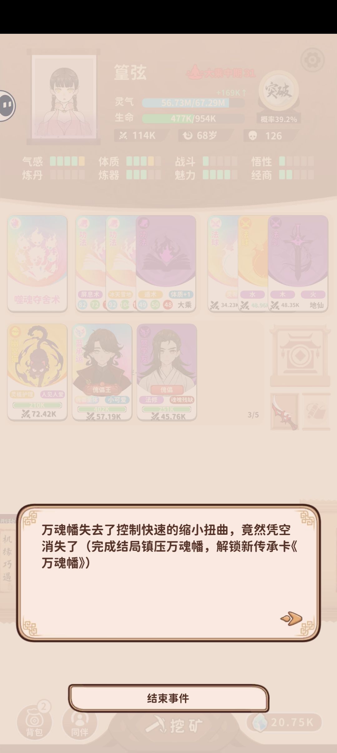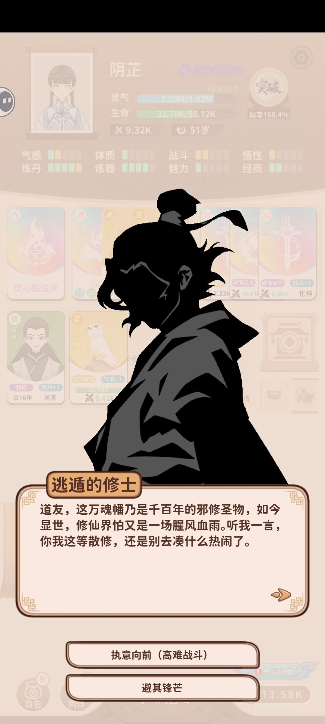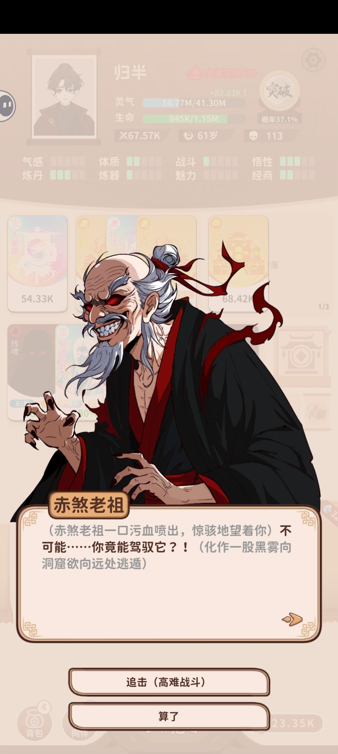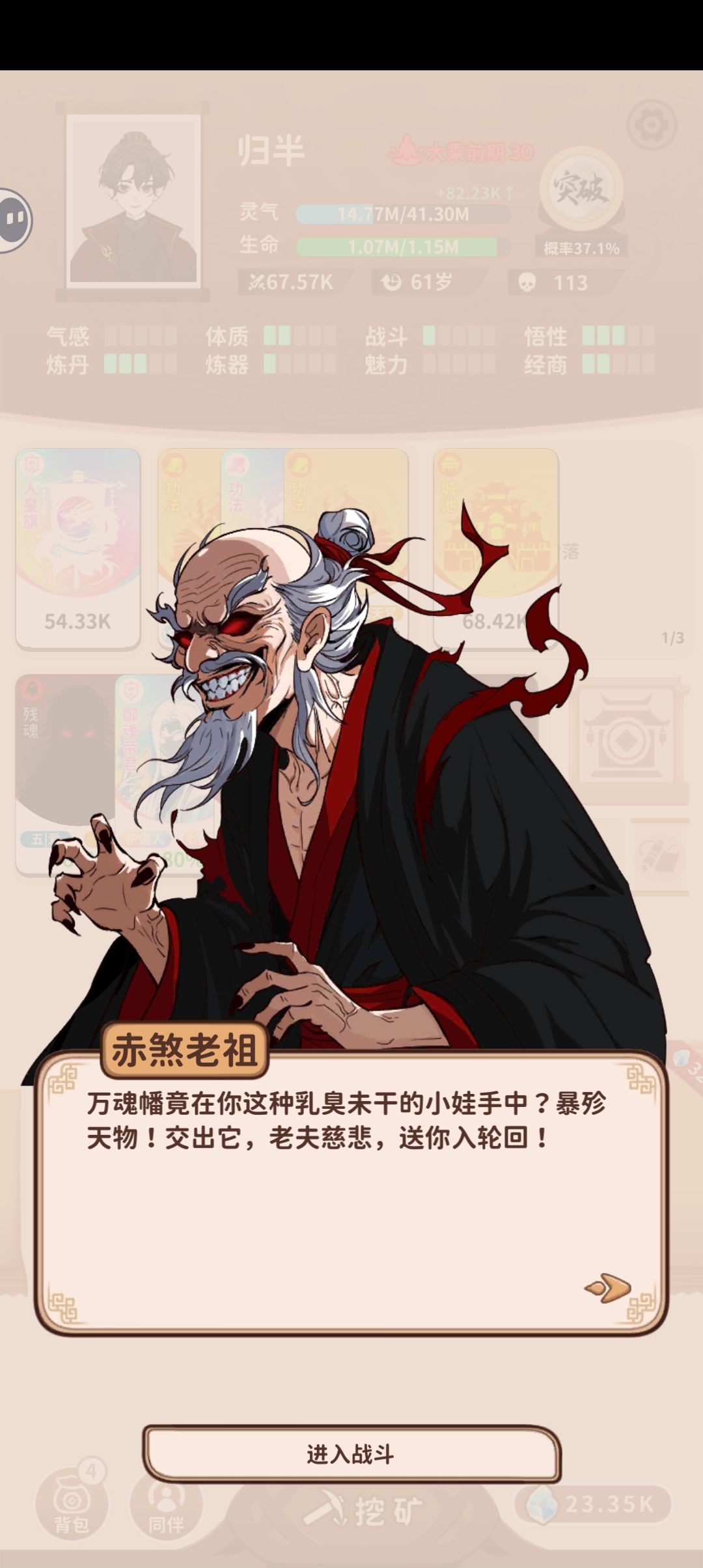 选择执意向前并打败赤煞老祖,完成成就(镇压万魂幡),这个有点难打,试了老白蜀山焚心,发现最简单的过法还是噬魂夺舍,(都是邪修,我避他锋芒?),功法还是遁术,尽快拉高等级,影子商场要注意伙伴,并且准备好三个傀儡和灵宠,武器要跟的上等级,打过去不算难,最好有个灵希相赠保险点。