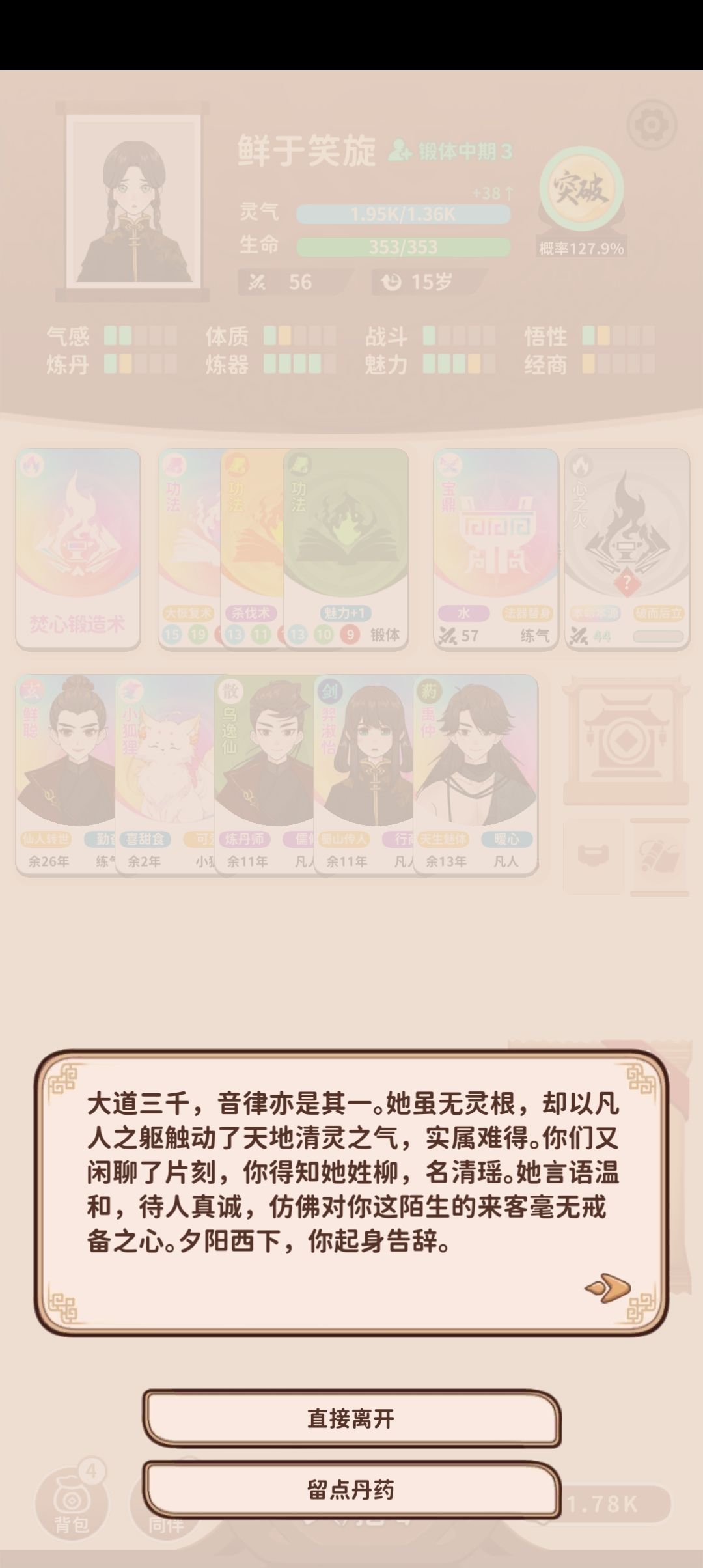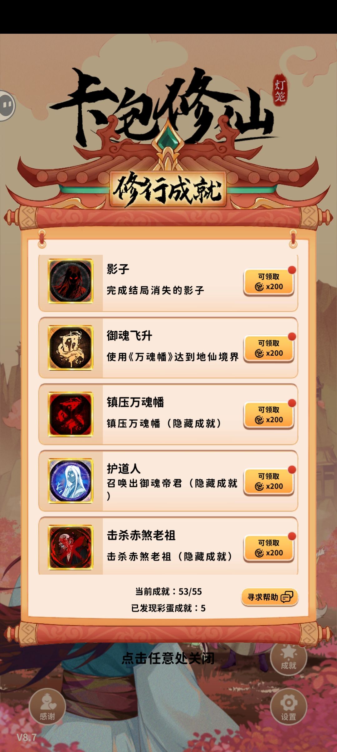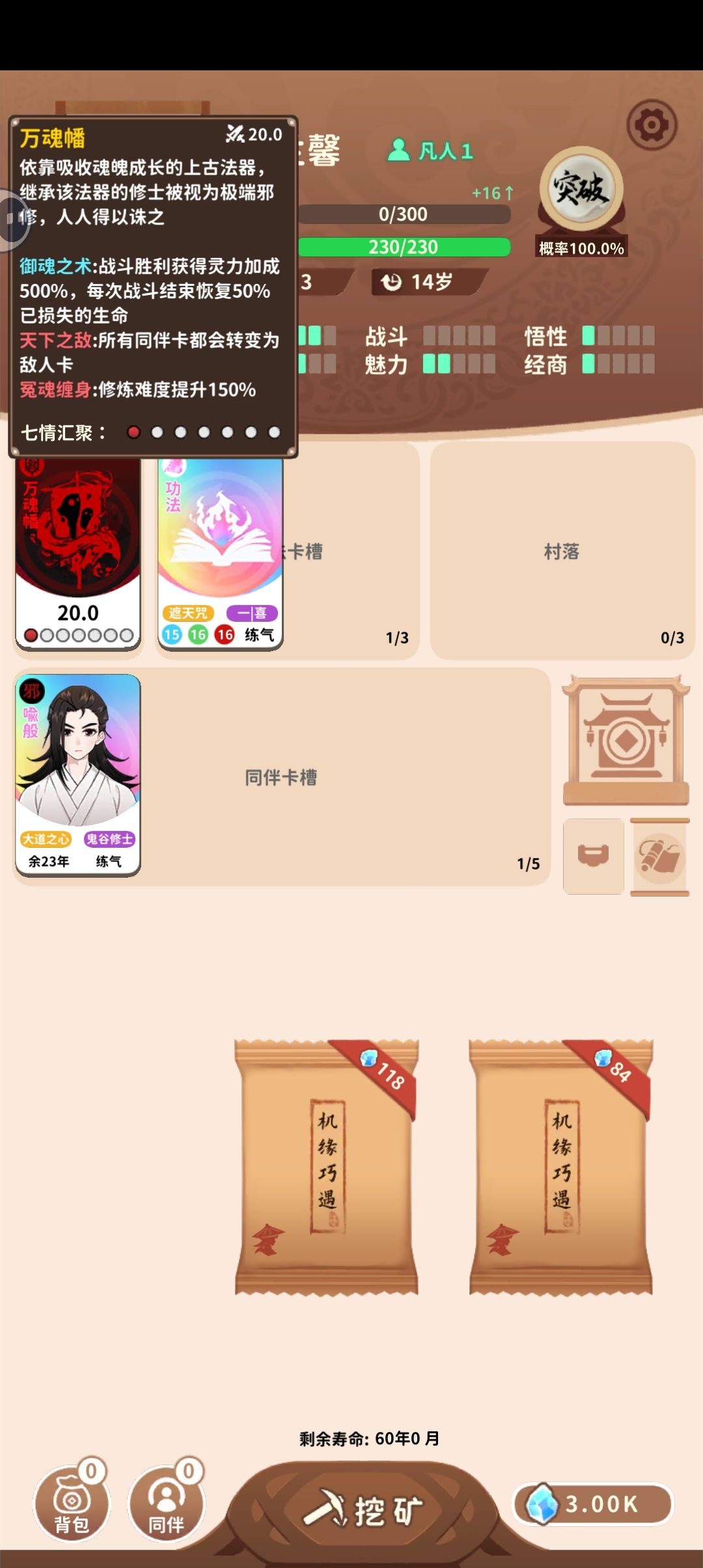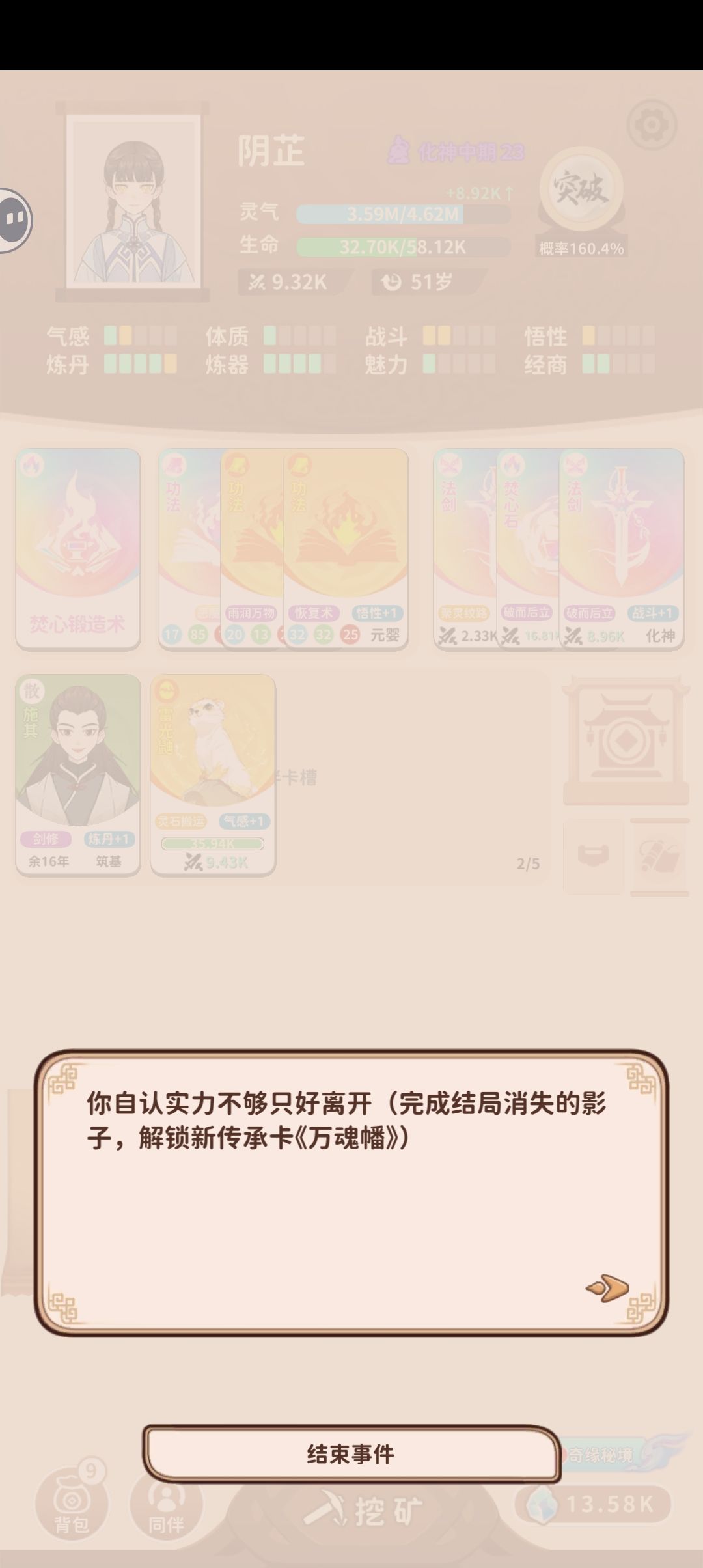 选择执意向前并打败赤煞老祖,完成成就(镇压万魂幡),这个有点难打,试了老白蜀山焚心,发现最简单的过法还是噬魂夺舍,(都是邪修,我避他锋芒?),功法还是遁术,尽快拉高等级,影子商场要注意伙伴,并且准备好三个傀儡和灵宠,武器要跟的上等级,打过去不算难,最好有个灵希相赠保险点。