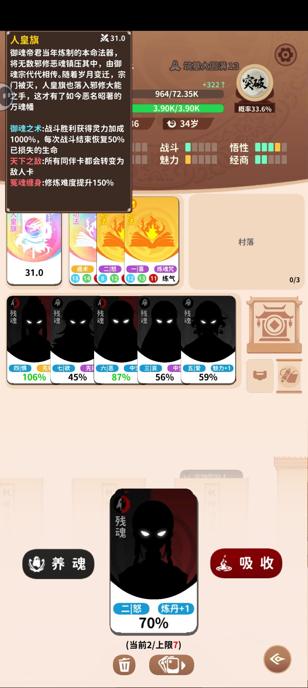 传承选择万魂幡,奇缘就不选了没有用,开局打怪遇到城镇不要屠城,不要屠城,不要屠城。通过打敌人和功法尽快奏齐喜,怒,哀,惧,爱,恶,欲。御魂帝君出现成为护道人,万魂幡变人皇旗,你的残魂攻击方式也会不受限制。如果屠过城有恶行值的话,御魂帝君不会成为护道人。(护道人成就完成)