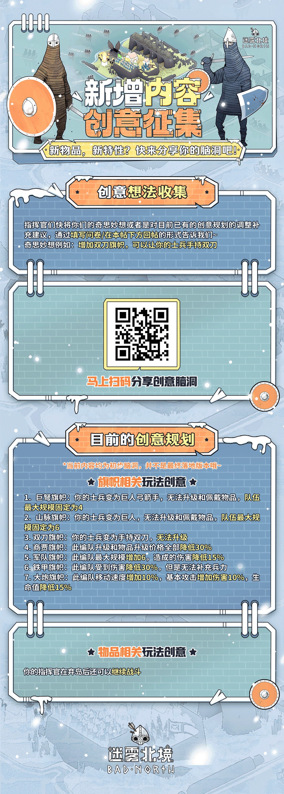 ②指挥官们分享创意脑洞,即视为同意授权《迷雾北境》手游后续评估并真正实装进游戏,如有采纳届时也会有一些惊喜内容掉落哦~╰(*°▽°*)╯